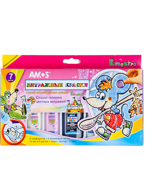 Состав: цвета конфетти по 22 мл - 2 белых, розовый, зелёный, голубой, сиреневый; контур черный 40 мл, трафареты, 4 виниловых листа, инструкция.