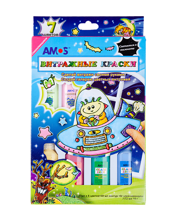 Состав: 4 класс. цвета по 22 мл, 2 цвета, светящихся в темноте по 22 мл : желтый и розовый , 1 контур черный 40мл, трафареты, 4 виниловых листа, клей-карандаш 8гр., инструкция.
